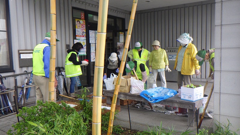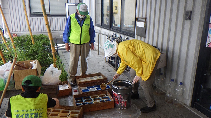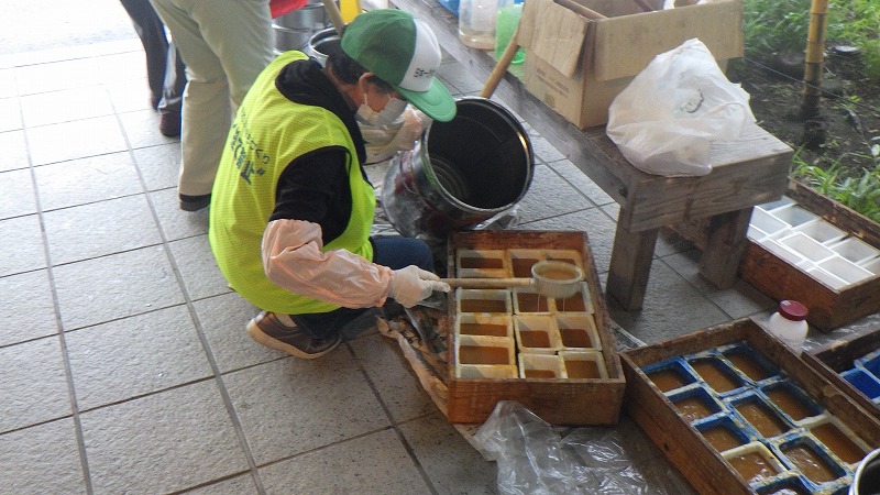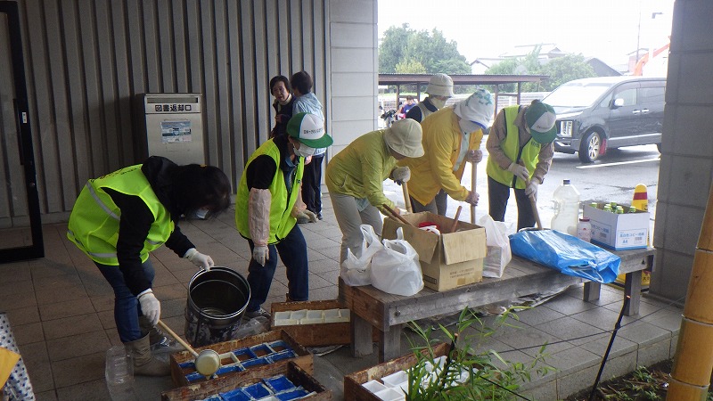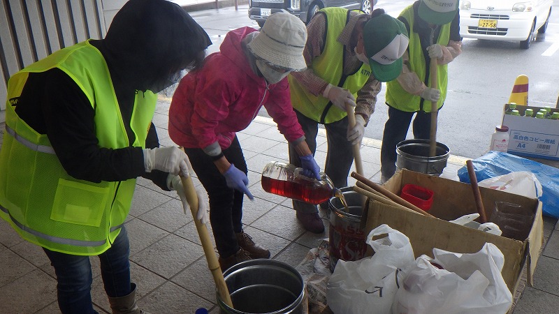 (TOP画面へ)↑今日のクリーン活動は校区内のごみ拾いと廃油石鹸つくりの予定でした。しかし、昨夜からの雨のためごみ拾いは中止し今回の廃油石鹸つくりの担当者のみでの廃油石鹸つくりです。 雨を避けるため、高田校区公民館入り口のテラスで作業をしました。もう皆さんも高齢になってきましたが長い間育んできたチームワークで作業はテキパキと進んでいきます。これからも長く頑張ってください。