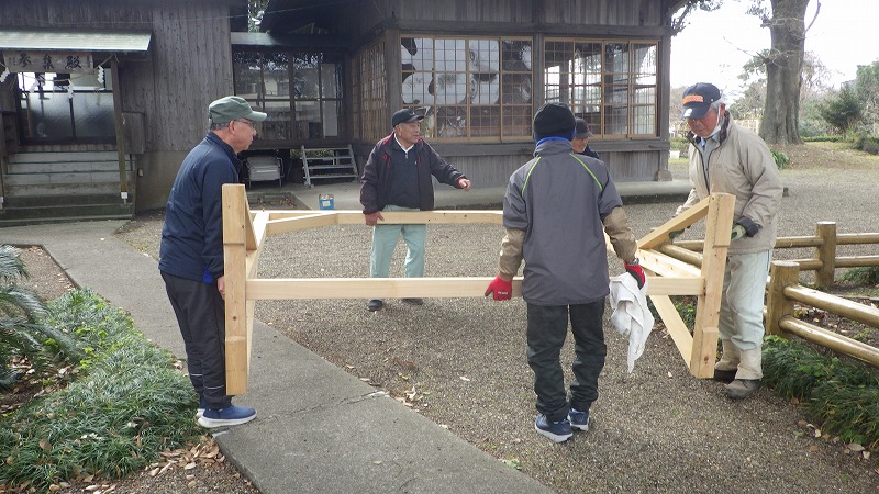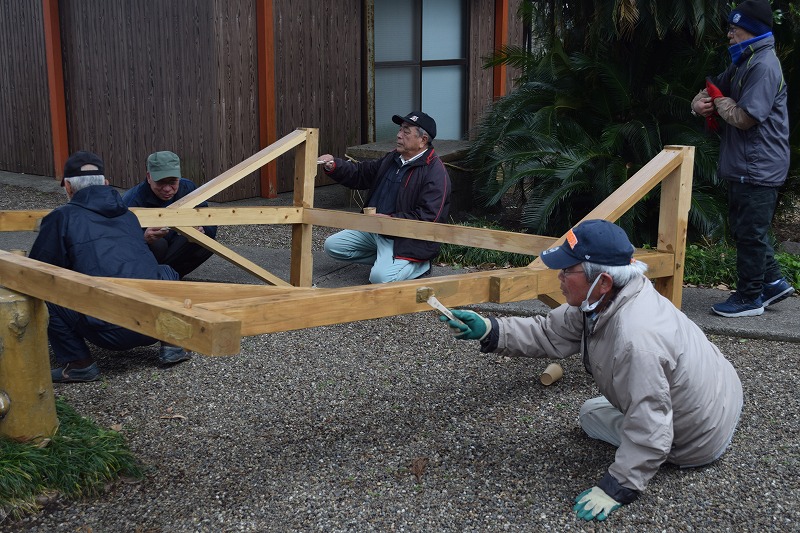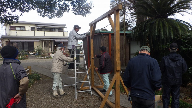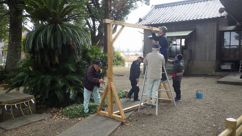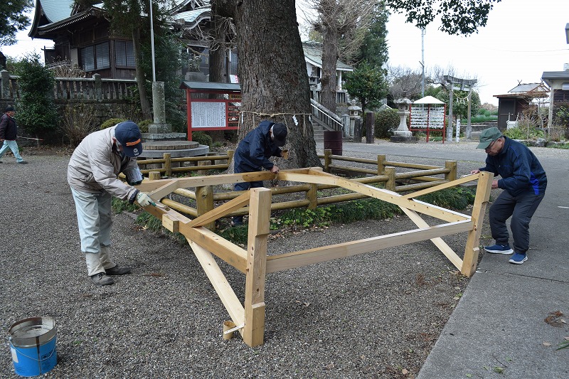 年末に設置され評判の良かった茅の輪も今日で撤去され、長い間使用できるように防腐剤の塗装をして保管です。