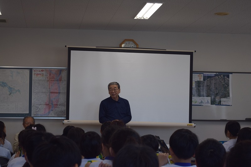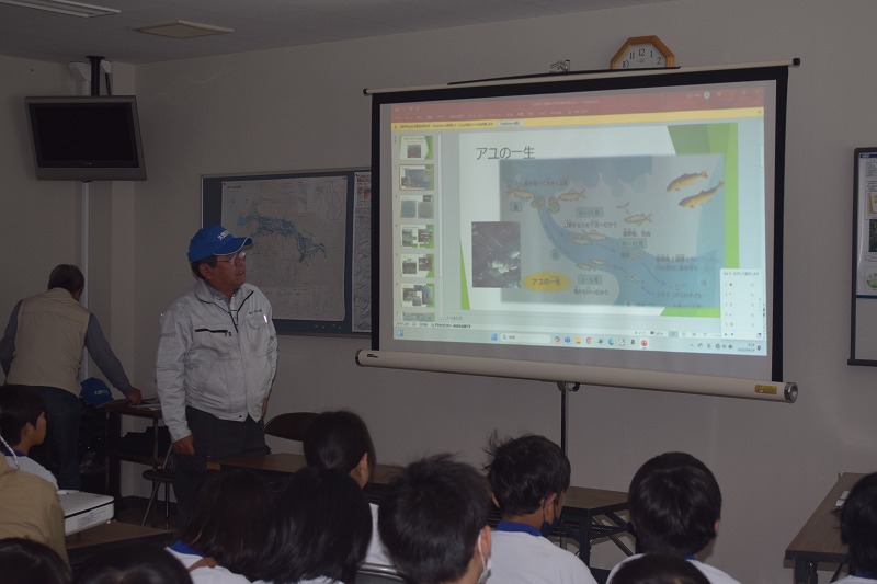 大野川漁協高田支部長釘宮さんのアユやウナギの生態について説明がありました。釘宮さんの話は幼い時からの大野川の体験や釣りの体験からきており、話を聞いていても実感の湧く面白い話が続き子供たちも興味津々で聞いていました。そのせいか、時間をオーバーする質問攻めにあっていました。でもうれしそうでした。