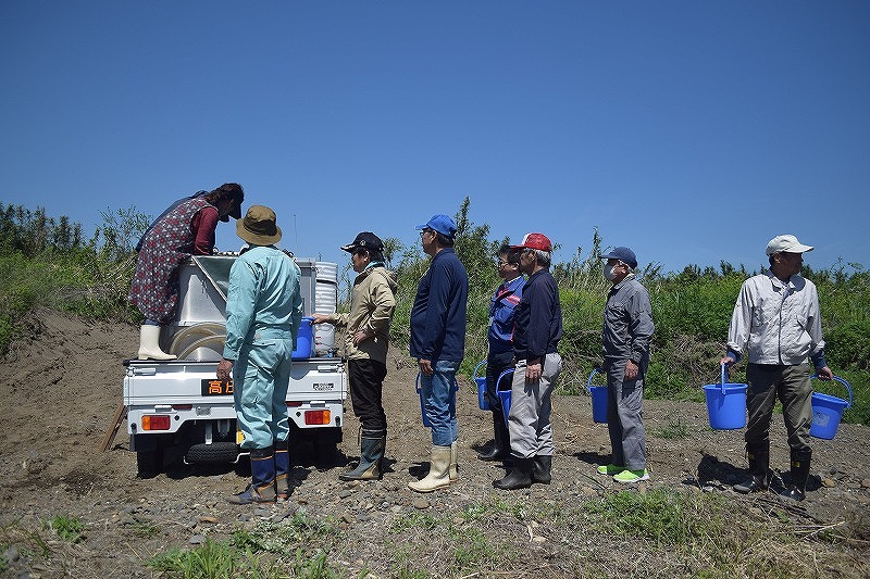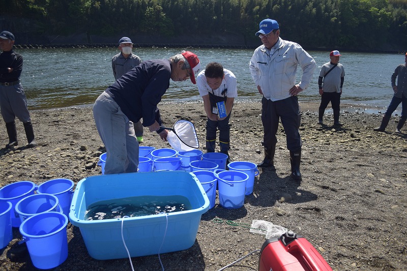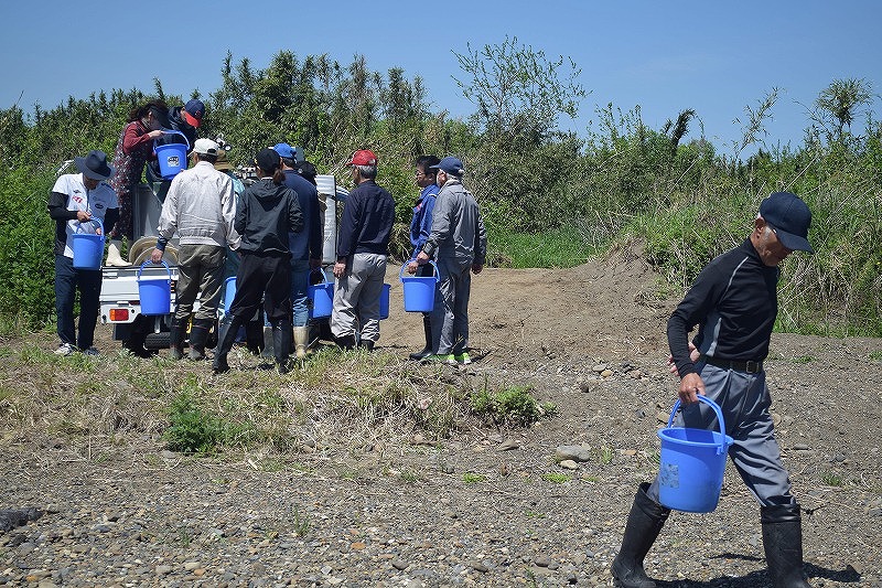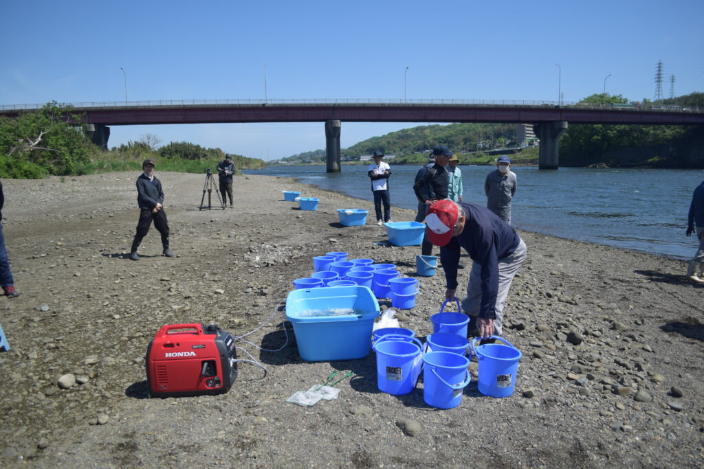 車に積まれたアユの稚魚を水槽から川近くに置かれた大きな容器まで運び、その中に入れられたアユを子供たちがバケツに入れ川に放流します。