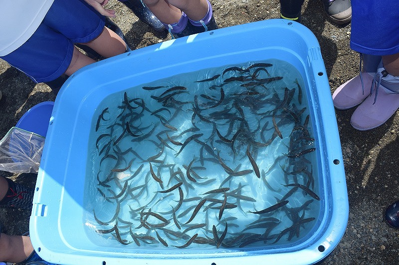 [子供たちの声] アユはいっぱいいたので何度もできて楽しかったです。ウナギもぬるぬるしてつかみにくかったけどおもしろかったです。と子供たちの声がありました。来年もアユとウナギの両方の放流ができるとよいですね。