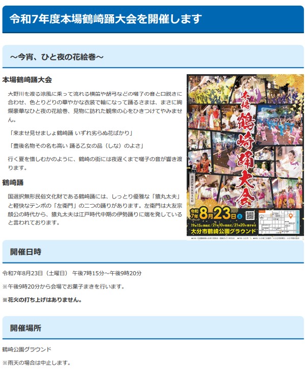 大分市のホームページで今年の本場鶴崎踊り大会の開催が発表されていました。<2025-06-16>