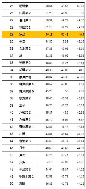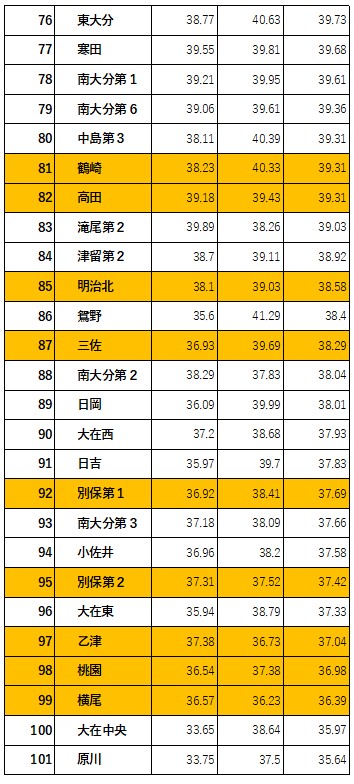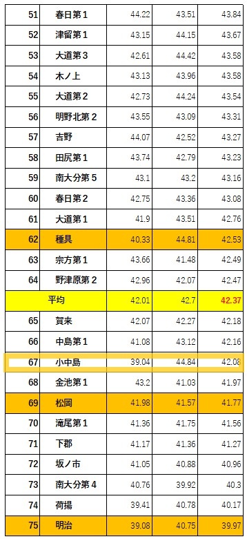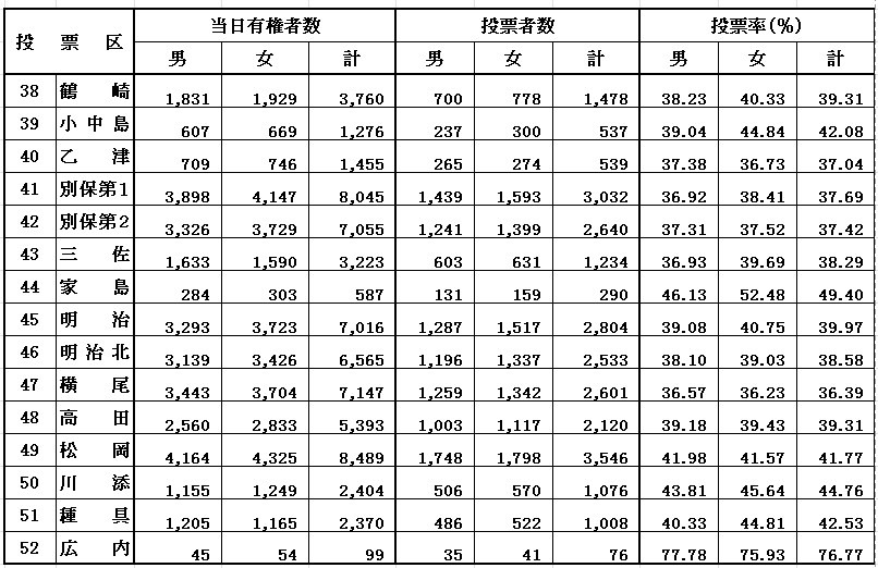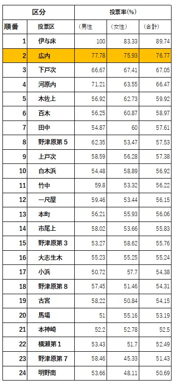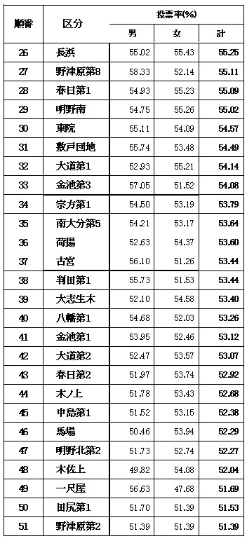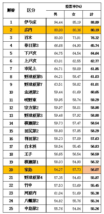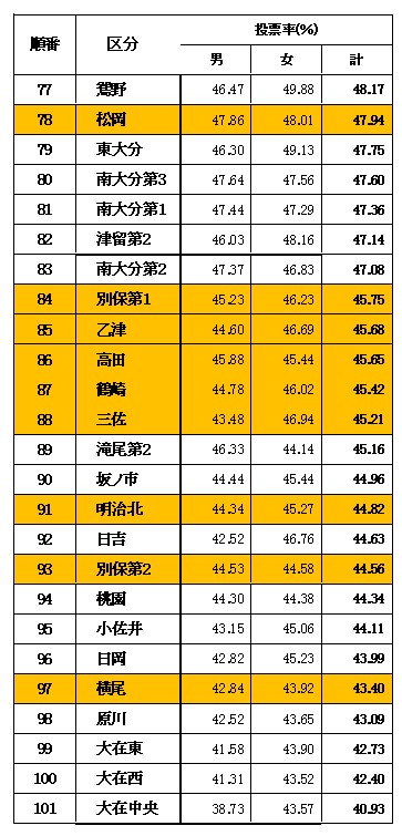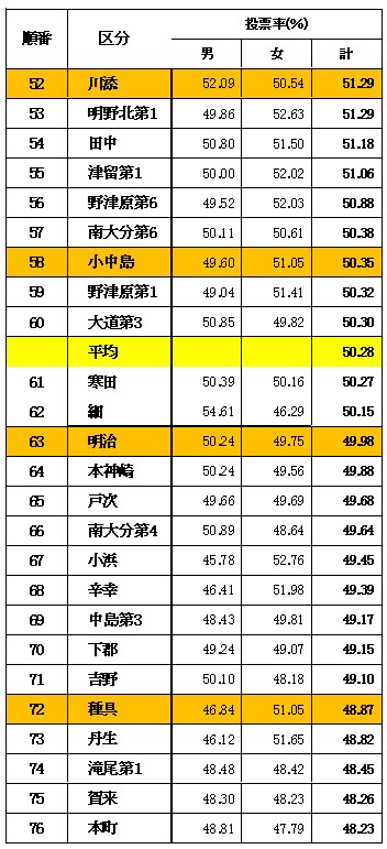 大分市内の投票区は101か所あり、鶴崎地区には15の投票区がありますが、下記の表を見ていただくとわかると思いますが、平均投票率を超えているのは広内、家島、種具の3か所に過ぎません。(なお、広内は2位です)