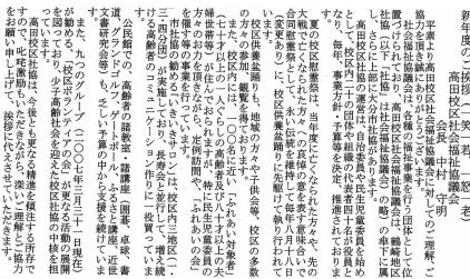 高校区社協は、今後とも更なる精進を傾注する所存ですので、叱咤激励もいただきながら、深いご理解とご協力をお願い申し上げて、挨拶に代えさせていただきます。