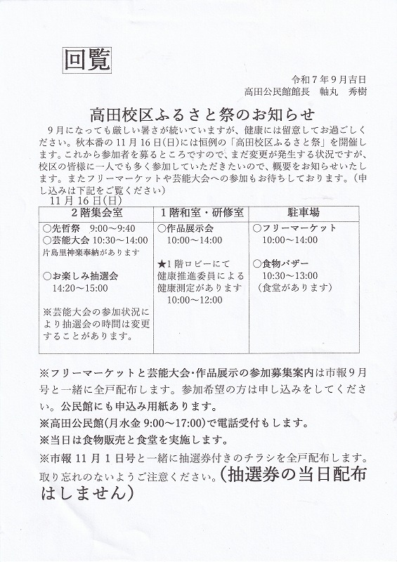 <回覧 公民館>高田校区令和7年ふるさと祭のお知らせ        & 募集 (フリマ―出店・作品出品・芸能大会出場者)