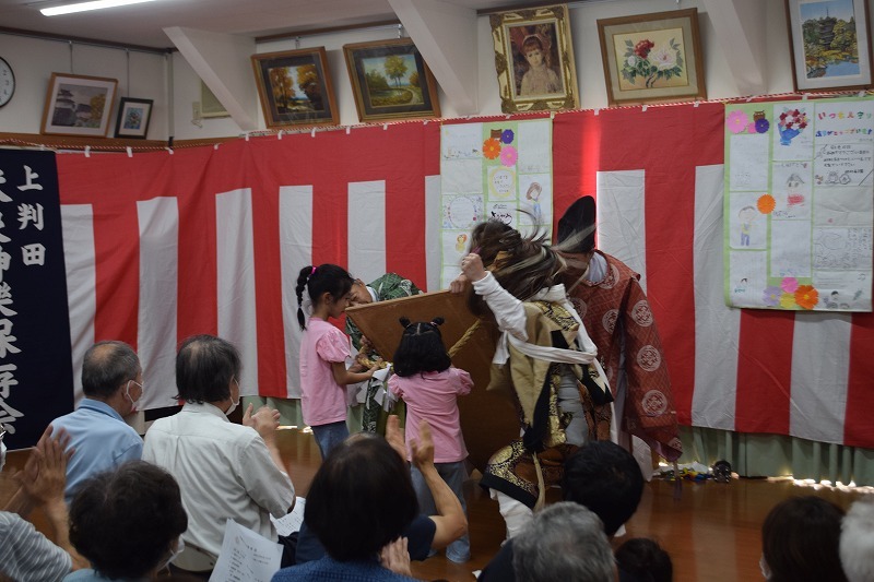 「戸開き(とひらき)」は、日本神話の「天の岩戸」神話に基づき、天照大御神が岩戸から引き出され、世の中に光が戻る様子を表現する演目です。暗い世の中を明るくするという戸開き。見ていた皆さんは戸が開かれる場面になっては拍手喝采で応援していました。その様子を見ているだけで私も気分が明るくなってきました。