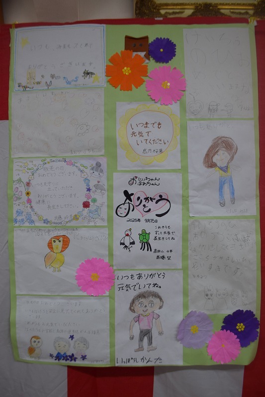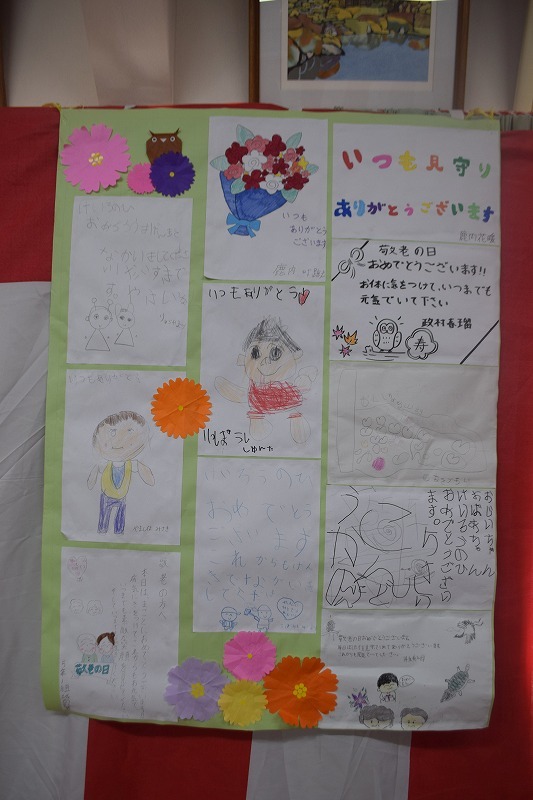 堂園地区の子供達から敬老者に寄せ書きを作ってくれました。また、代表の子供達からお祝いの言葉も寄せられました。
