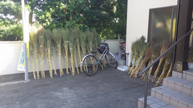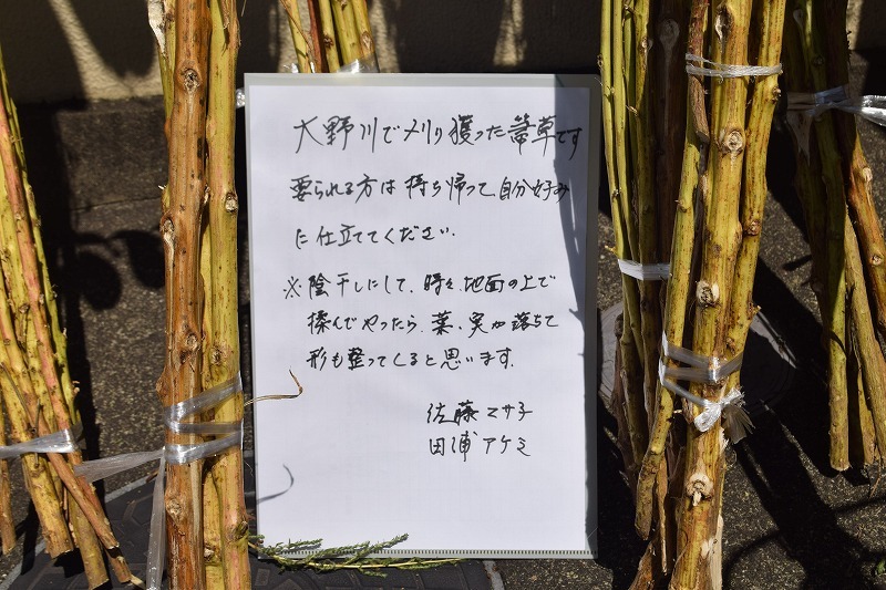 大野川河川敷で花文字を作ったりして花壇の世話をされている佐藤マサ子さんと田浦アケミさんがほうき草でホウキを作成しました。無料なので帰りに持って帰ってくださいとのこと。
