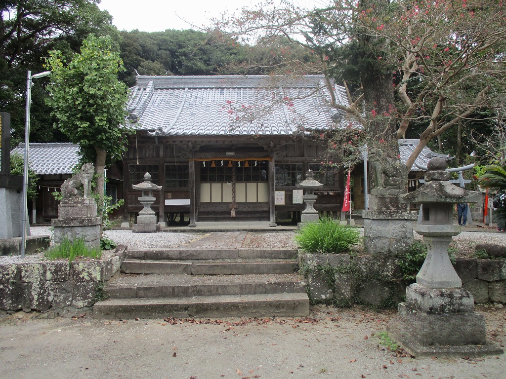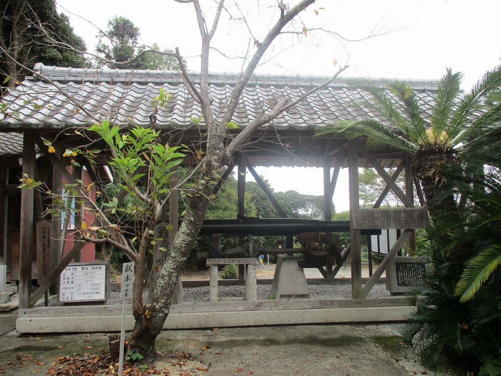 水雷壕、回天格納庫、実用頭部格納庫の横穴が残る小山には、回天神社があります。この神社は、当初大神突撃隊庁舎内に祀られていましたが、終戦後の昭和21年 (1946)に元隊員の懇願により住吉神社の境内に遷座されました。現在の神殿は平成13年(2001)に新築され、その横に回天の3分の1模型と海中より引き上げられた九三式魚雷後部が展示されています。