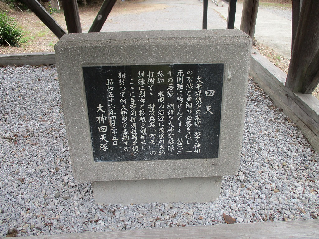記念公園から100mほど離れた丘の上に回天神社があります。もとは住吉神社だったようですが、大神基地内にあった回天神社を戦後に住吉神社の横に遷座されました。