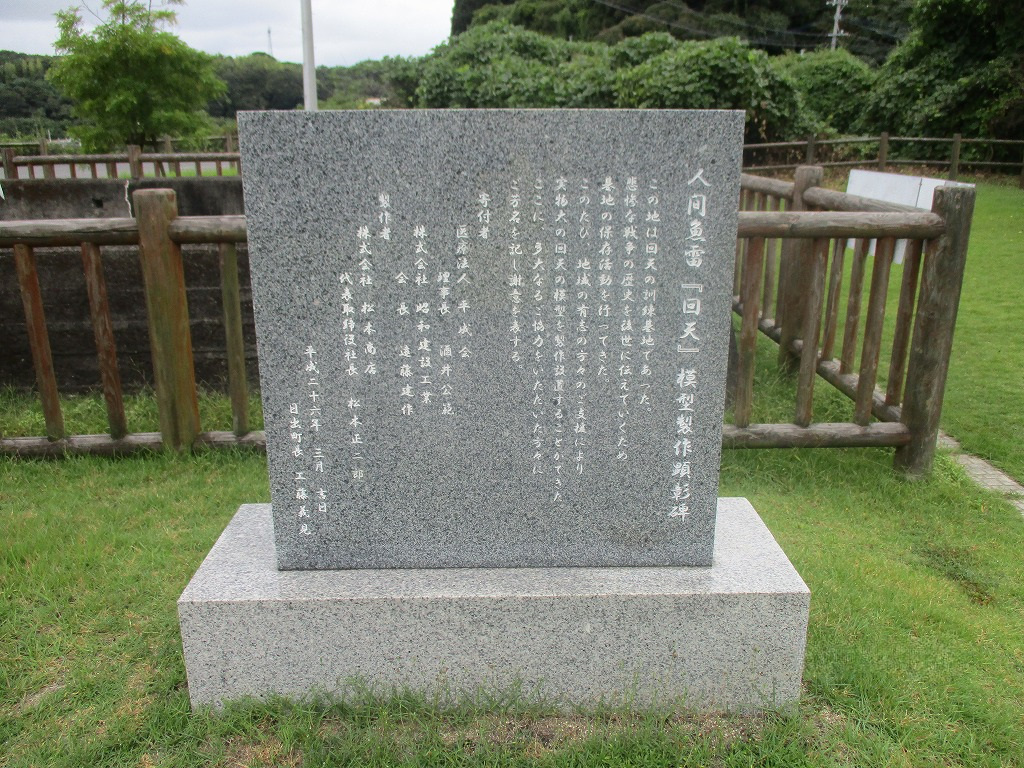 この記念公園は2015年(平成27)整備され、そこには人間魚雷の実物大の模型とともに回天や基地の資料が展示されています。