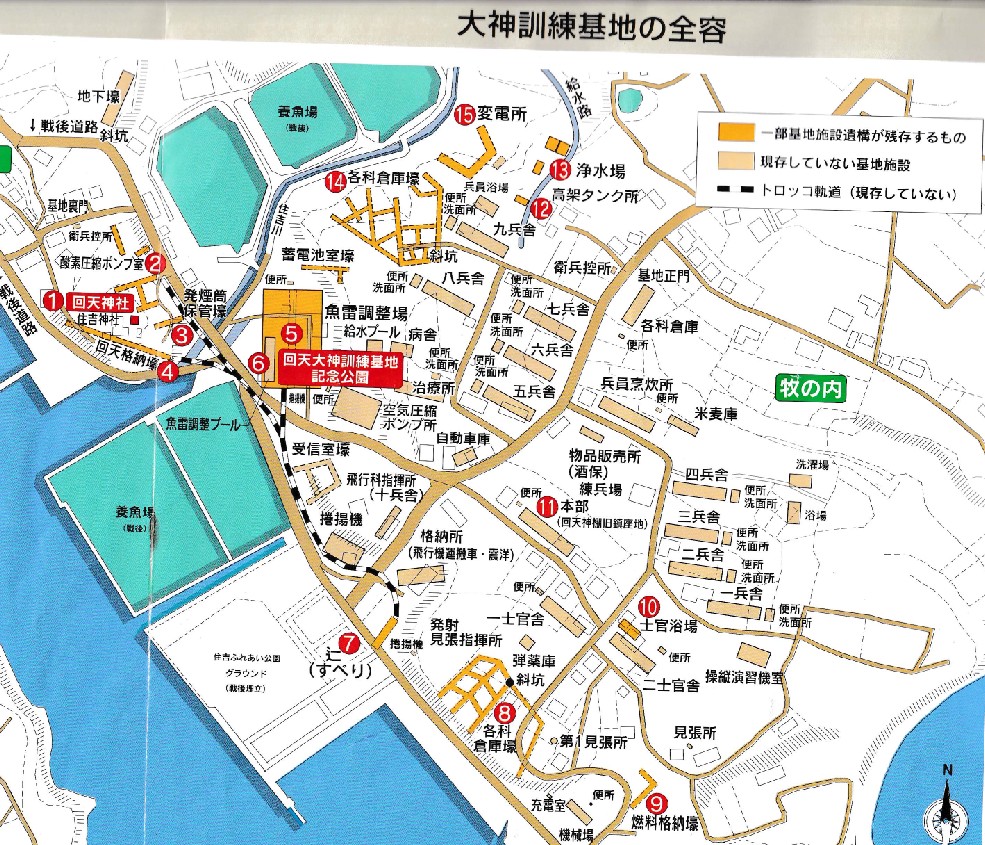 昭和20年(1945)4月25日に突撃隊司令、山田盛重大佐以下兵員2,000名の構成による大神回天基地隊が開設され、基地内施設として、舎屋51棟、魚雷調整場プール、すべり、変電所、各種地下壕、浄水場、練兵場、桟橋等が整備されました。