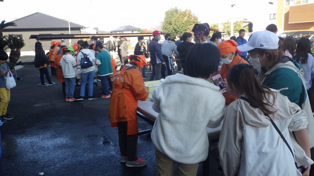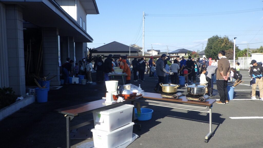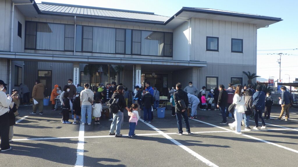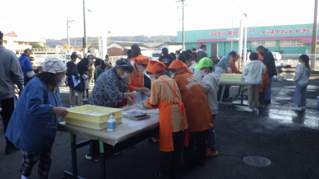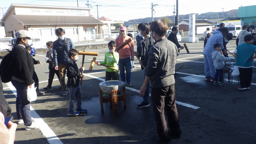 令和7年12月7日(日)、9時からお餅つき体験が高田校区公民館駐車場で開催されました。今年は天気が良かったせいか、昨年より多いような気がしました。