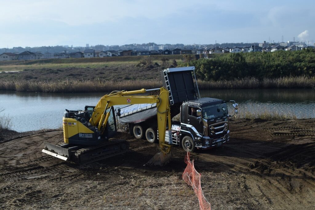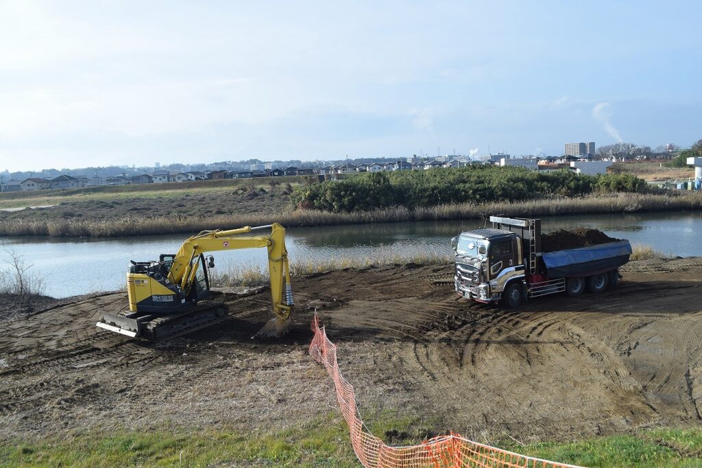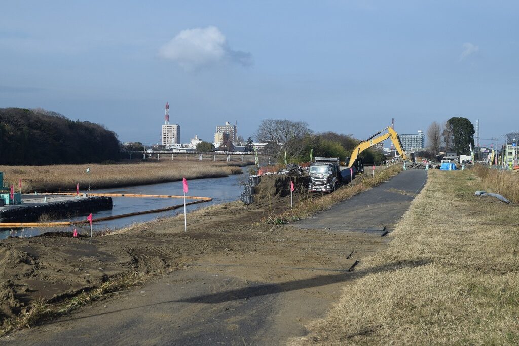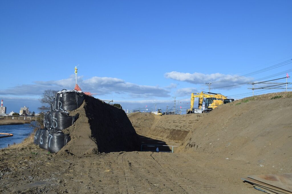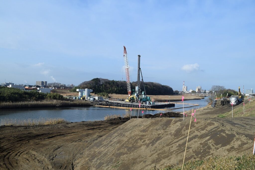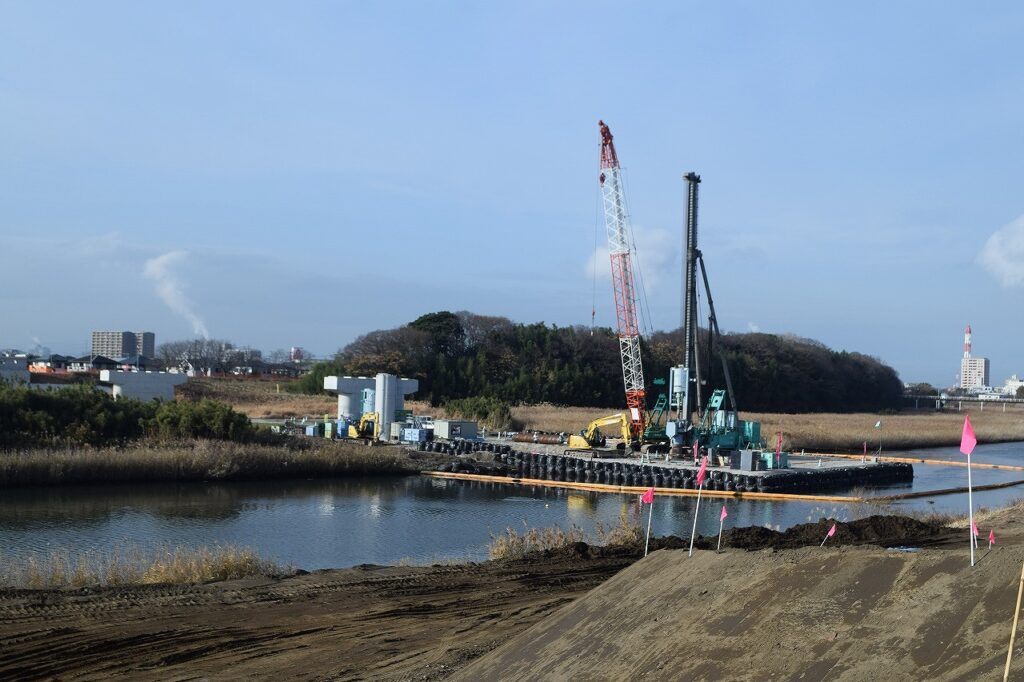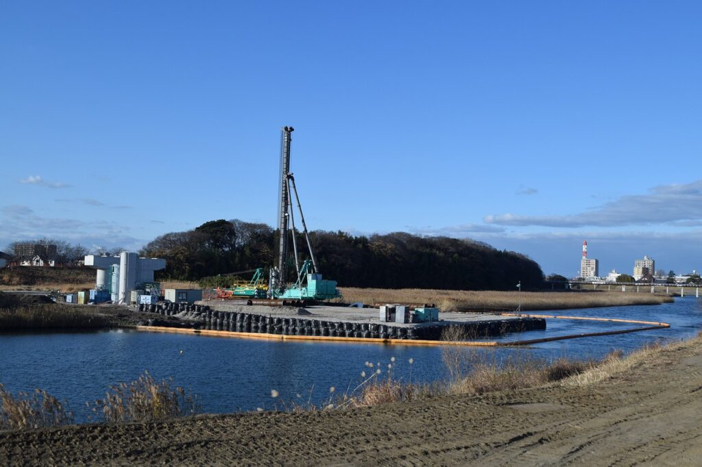 河川内の橋脚施工用ヤード、及びA2橋台用施工ヤードが完成し、橋台の基礎工事のための機械が搬入し取付設置作業が行われていました。来週ぐらいから基礎工事が始まりそうです。