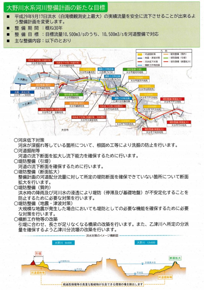 松岡から鶴崎までの大野川の整備計画です。河床整備だけでなく、引堤として堤防の位置がかわるものもあります。身近な問題です。よく見てください。