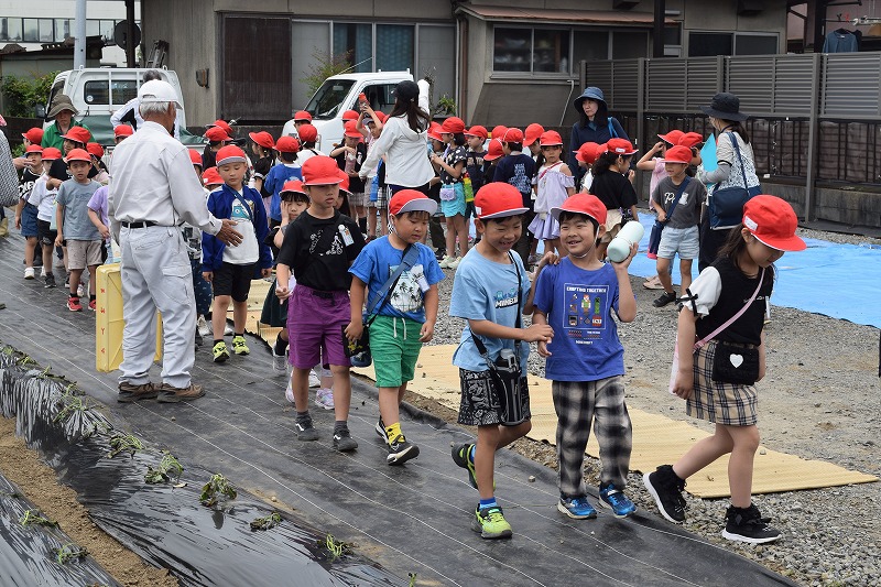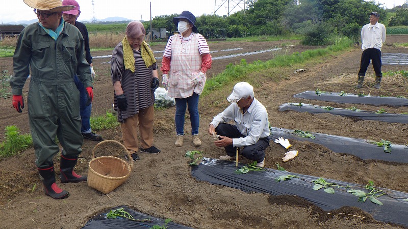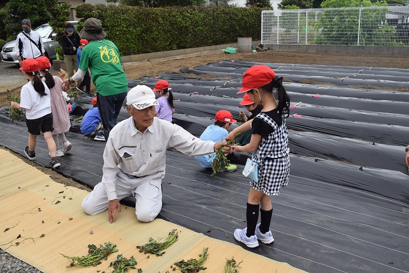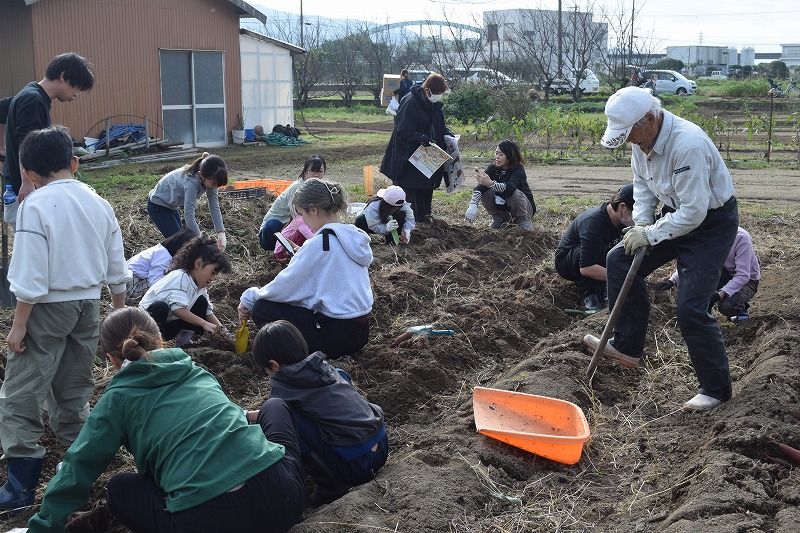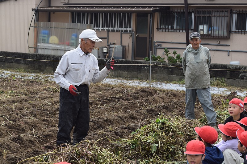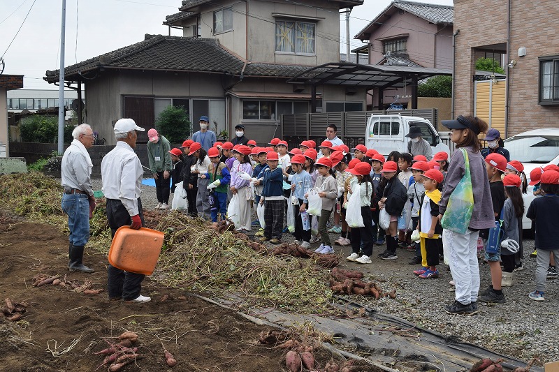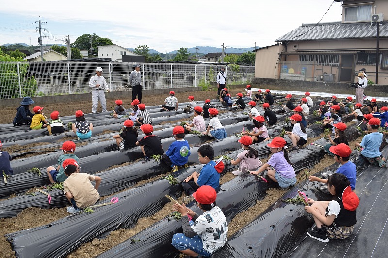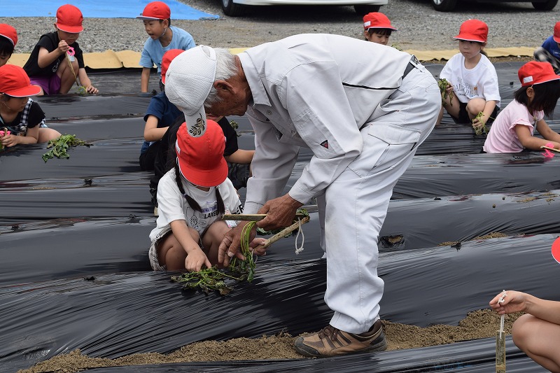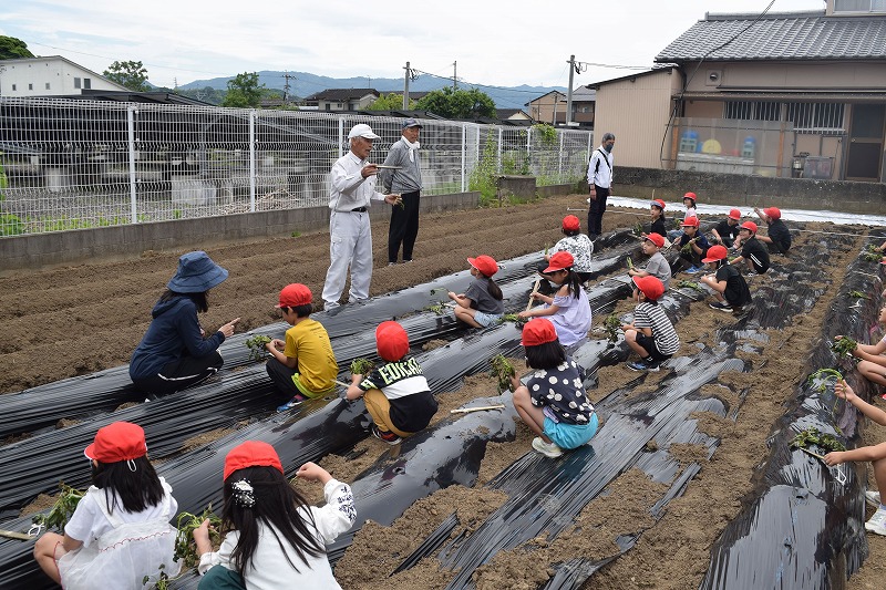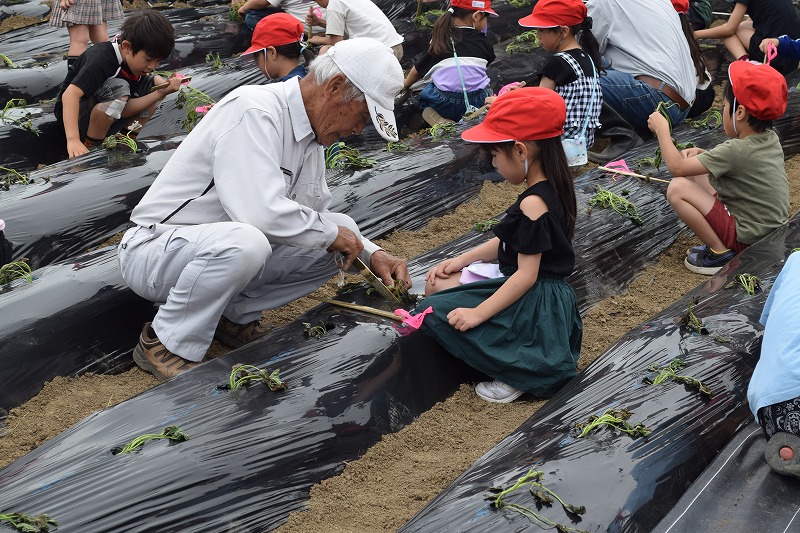 関門の土地を借り、高田小学校一年生のいもほり体験を実施しました。佐藤さんの植え方の指導を子供たちは真剣なまなざしで聞いています。