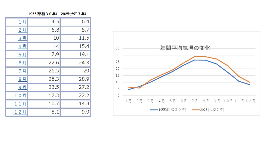 昭和30年と令和7年の年間平均気温の変化