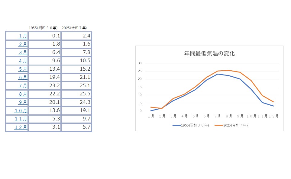 昭和30年と令和7年の年間平均最低気温の変化
