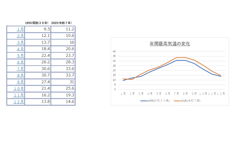 昭和30年と令和7年の年間平均最高気温の変化