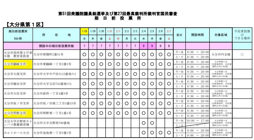 期日前投票は1月28日~2月7日までです。最寄りでは鶴崎支所、明野支所 (詳細は下記に記載)