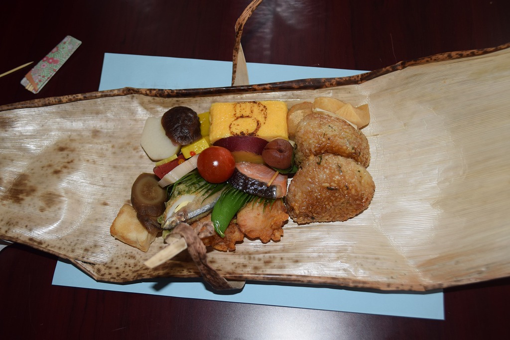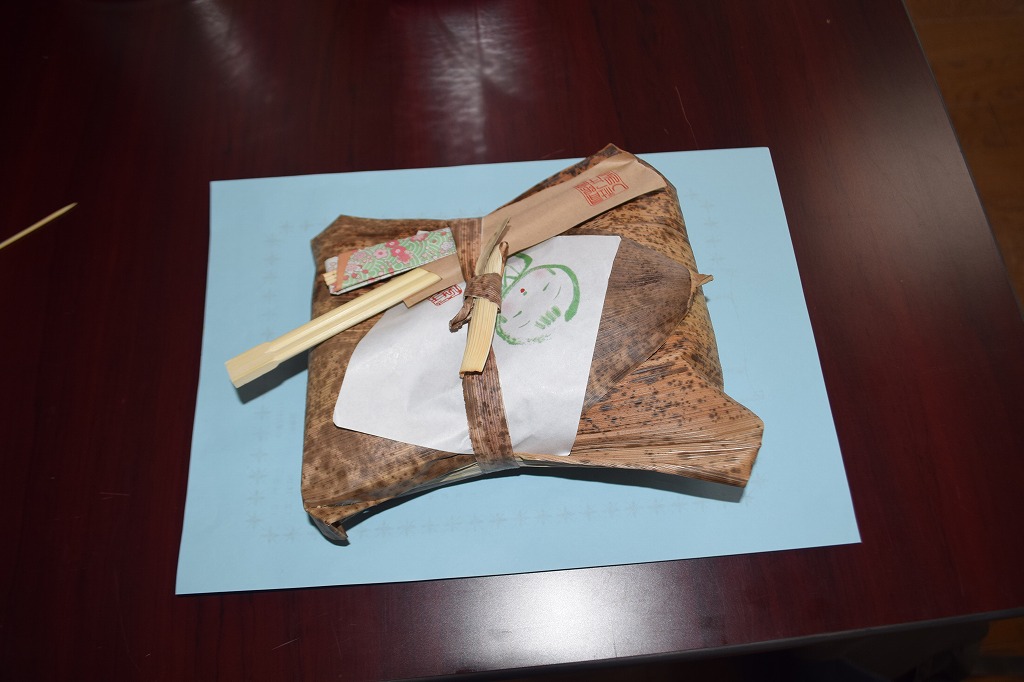 ちょっと早めの昼食です。なつかしの竹皮に包まれた弁当。小さい頃はおにぎりを包んでいたのを思い出しました。みなさん、懐かしく思いながら食事をされていたのではないでしょうか。[ちなみに、竹皮の表面はロウ状の皮膜を持ちながら通気性 に富み、撥水性が高く外部からの細菌を避けつつ保護する役目に優れているそうです。]