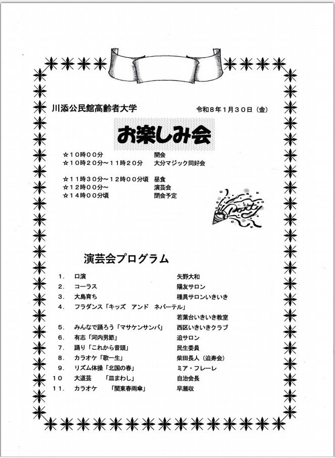 プログラムにそって「高齢者大学お楽しみ会」の様子を見ていきたいと思います。