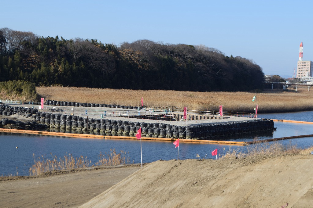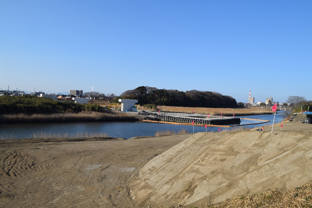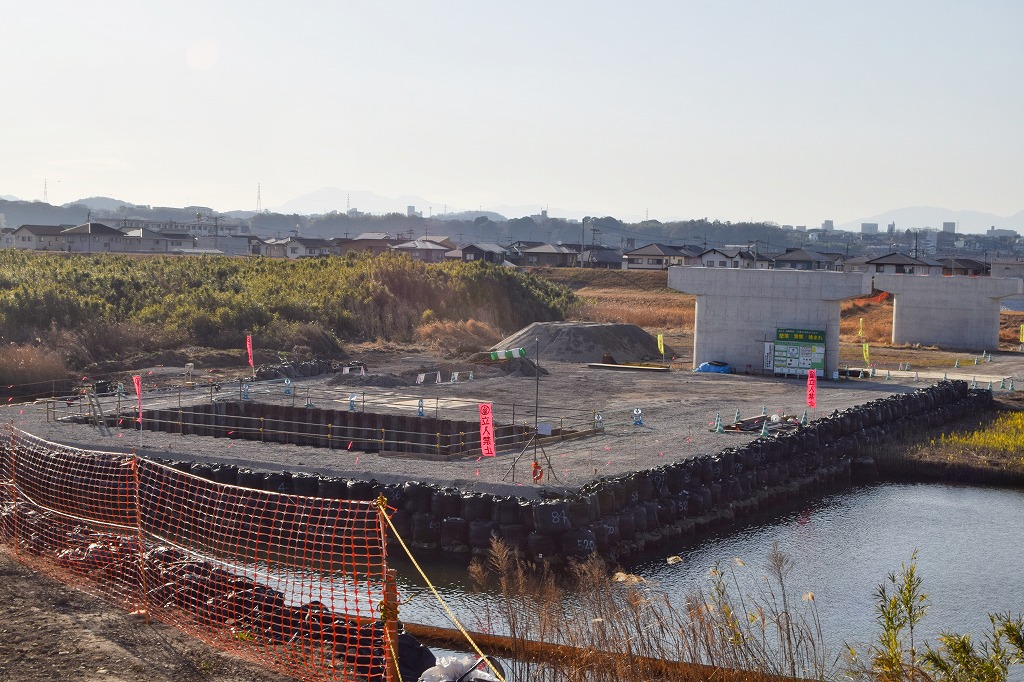 現在は乙津川の中央にP3橋脚の施工をしており、基礎杭が完了したところです。来月から基礎掘削に入るものと思われます。