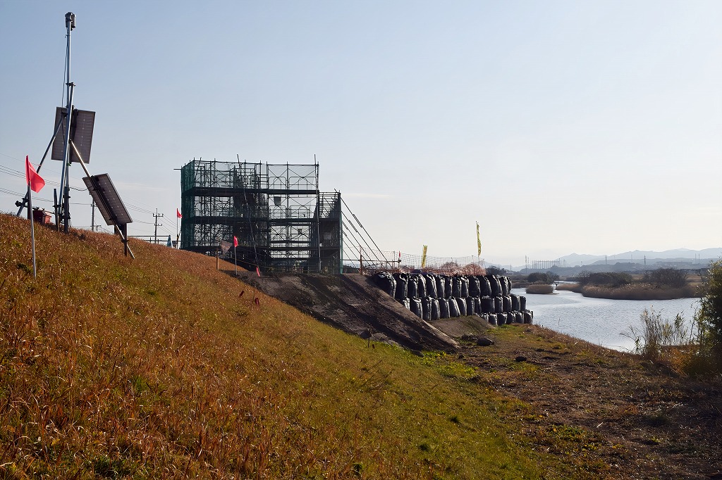 河川内の橋脚施工用ヤード、及びA2橋台用施工ヤードが完成し、橋台の基礎工事のための機械が搬入し取付設置作業が行われていました。来週ぐらいから基礎工事が始まりそうです。