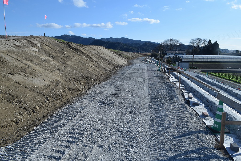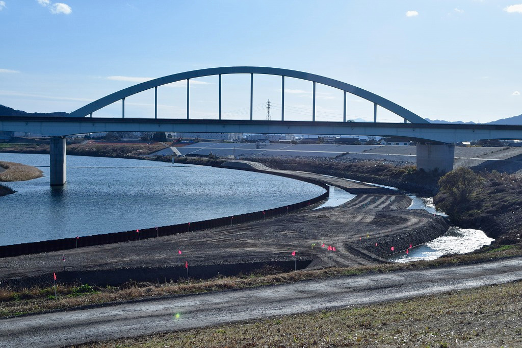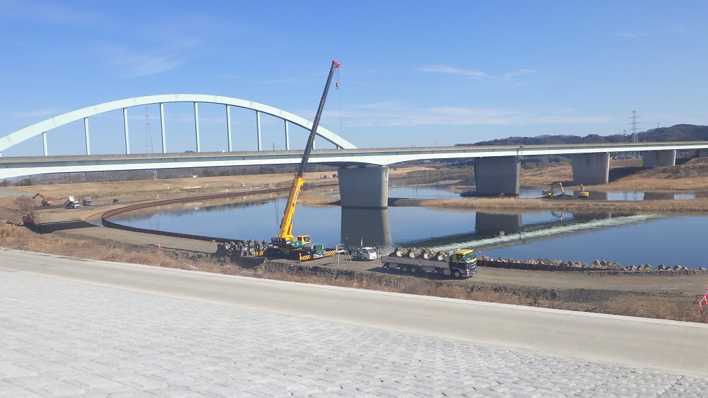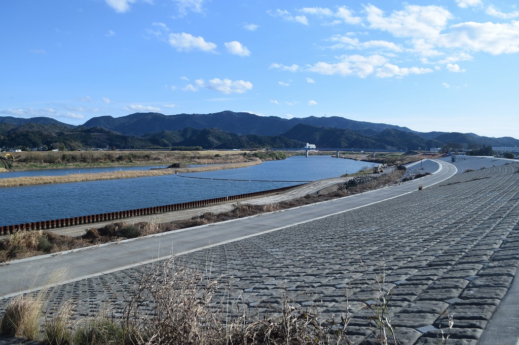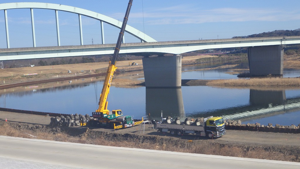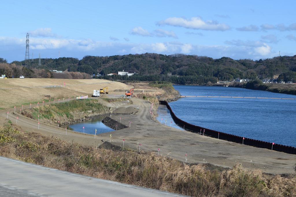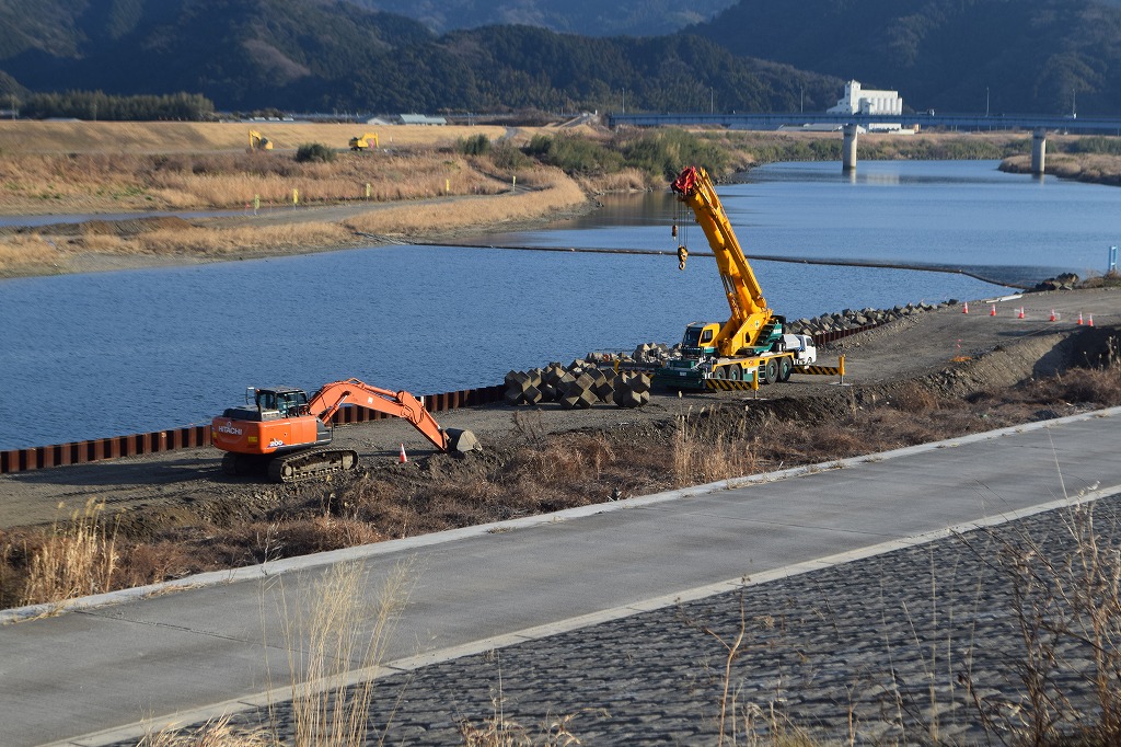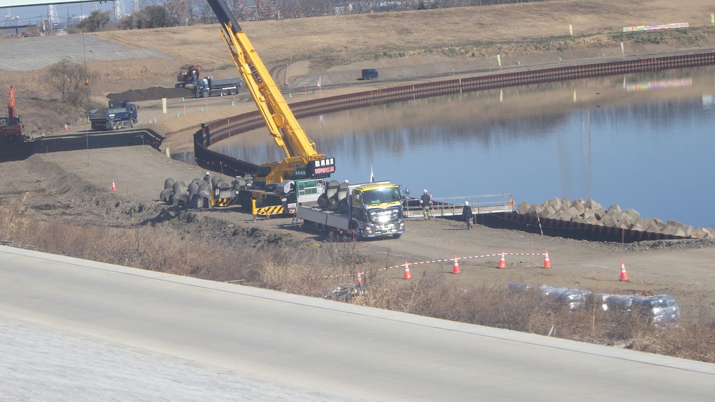 根固めブロックの下部側の据え付けは12月末で完了し、大野川宮河内側から土運搬がされ、鋼矢板より堤防側の埋め立て及び土砂の城内ストックが行われています。