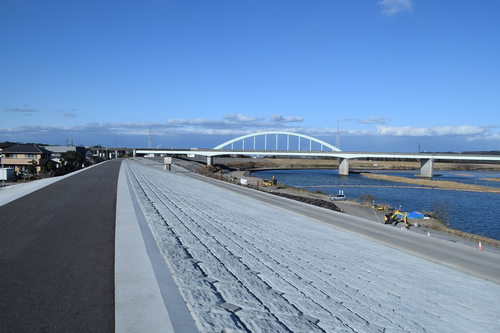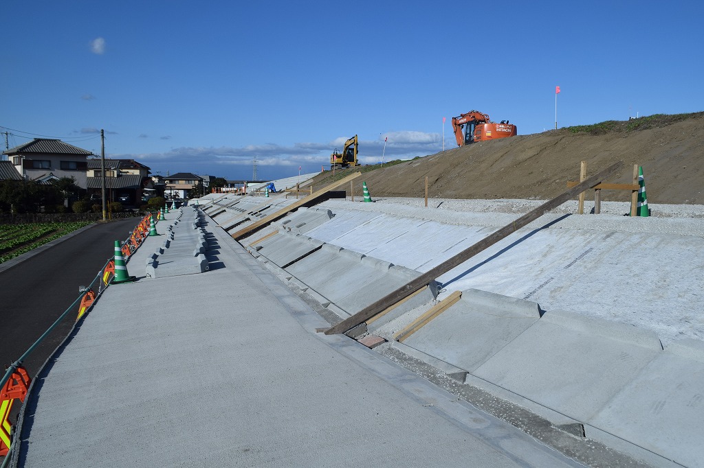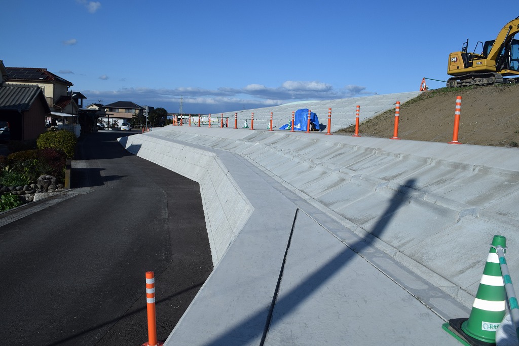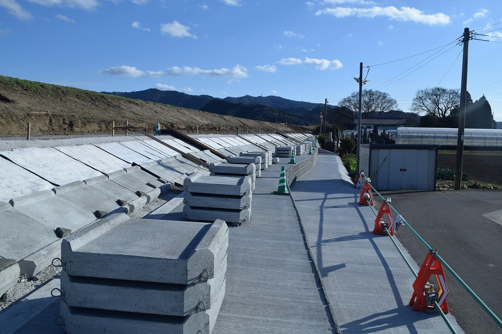 大津留の堤内側に法面ブロックによる法面保護工が施工されていました。