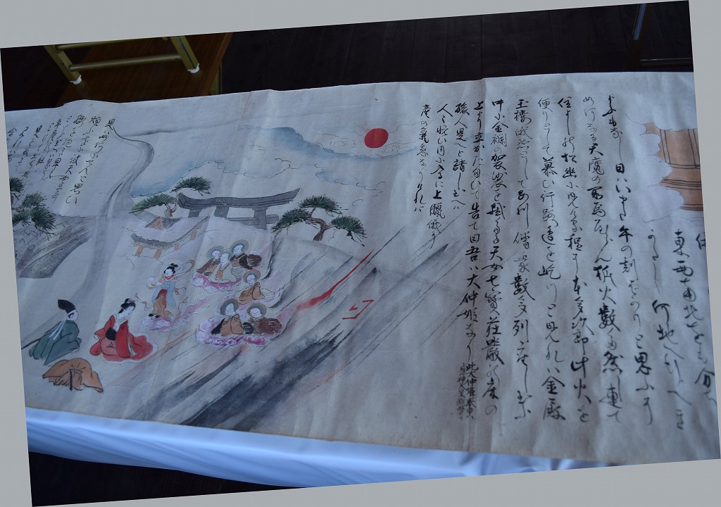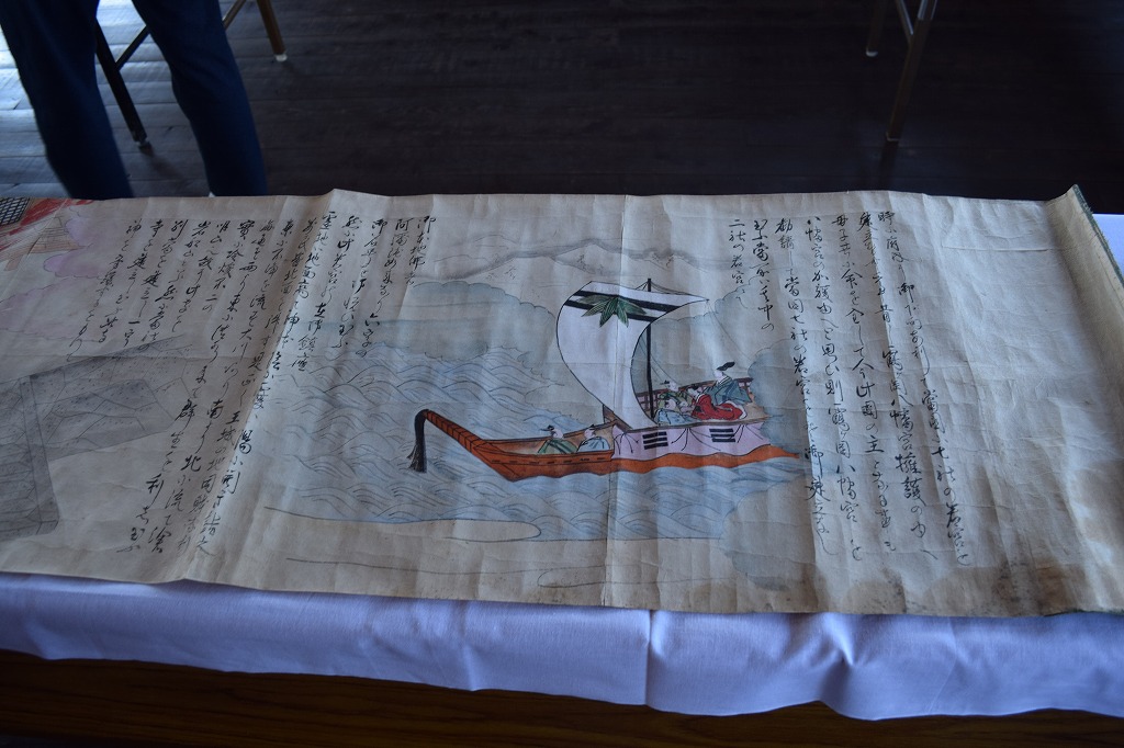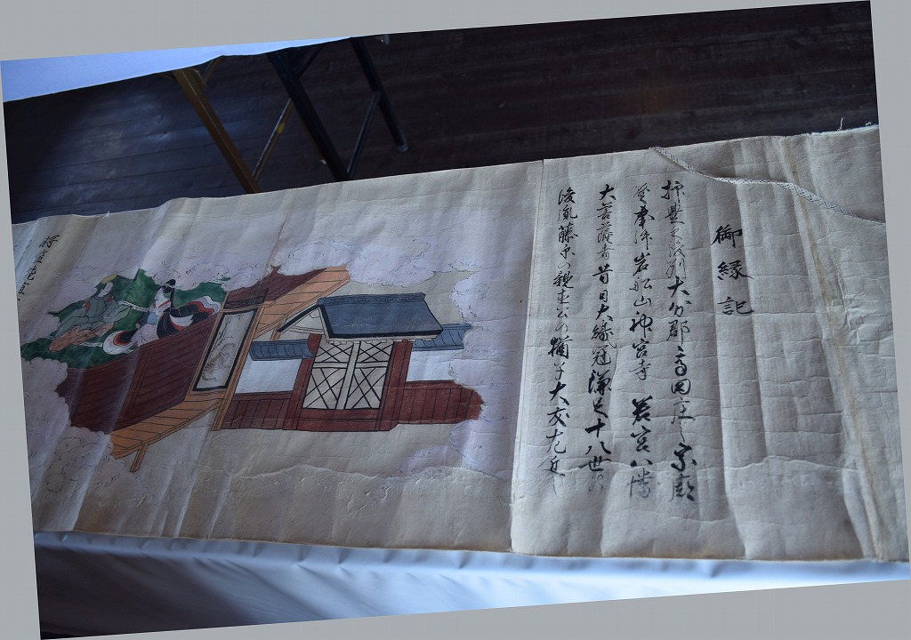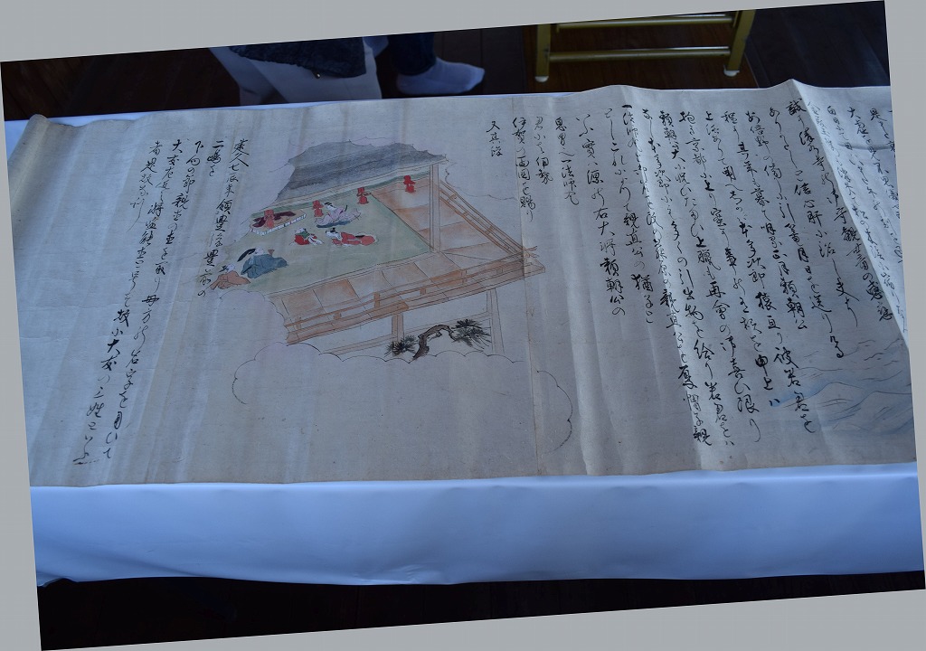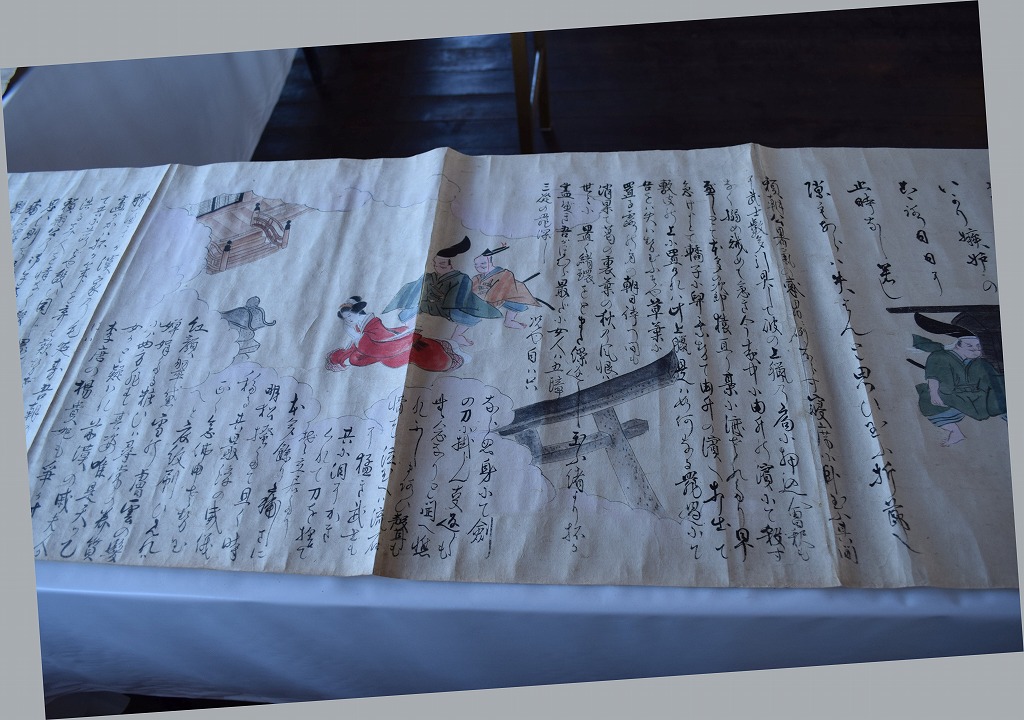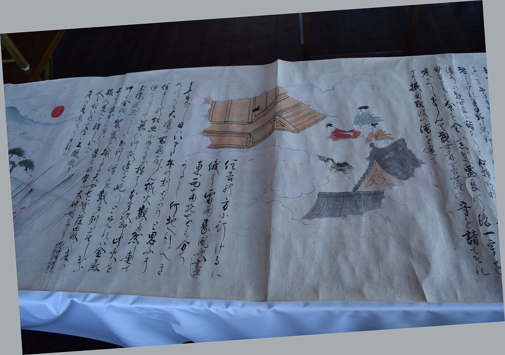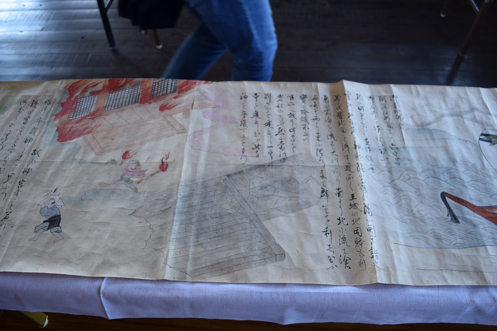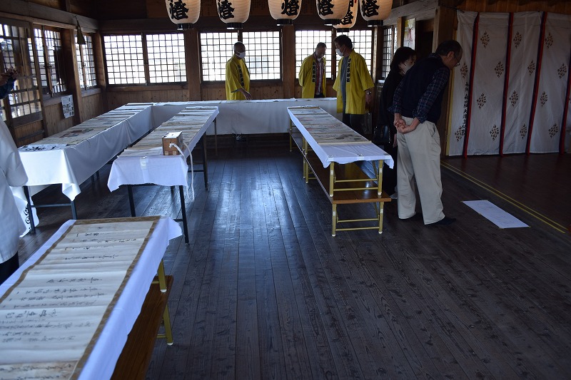 神社では宮総代の方が受付をされており、神社の拝殿には絵巻物がテーブルに展示されていました。受付の方に写真撮影の確認を取るとOKということで急いで絵巻物の写真を撮らせていただきました。慌てて撮ったためうまく撮れておらず後で後悔しています。