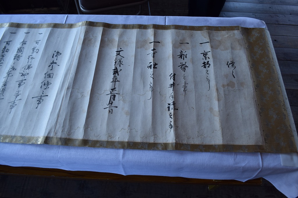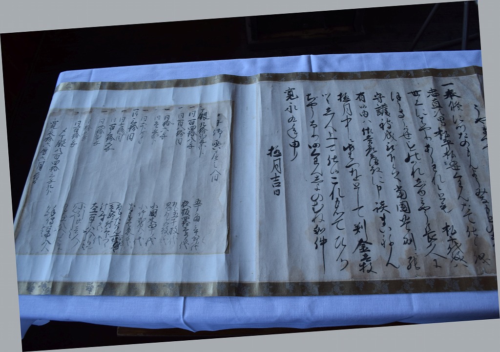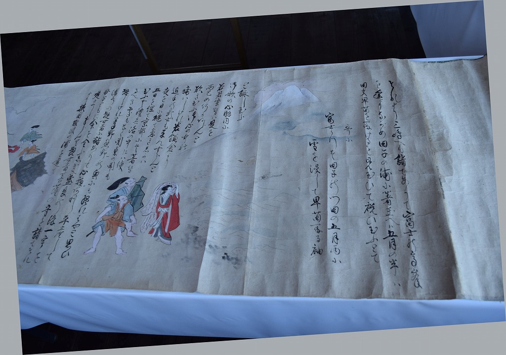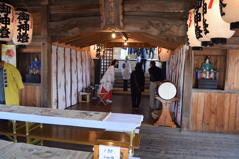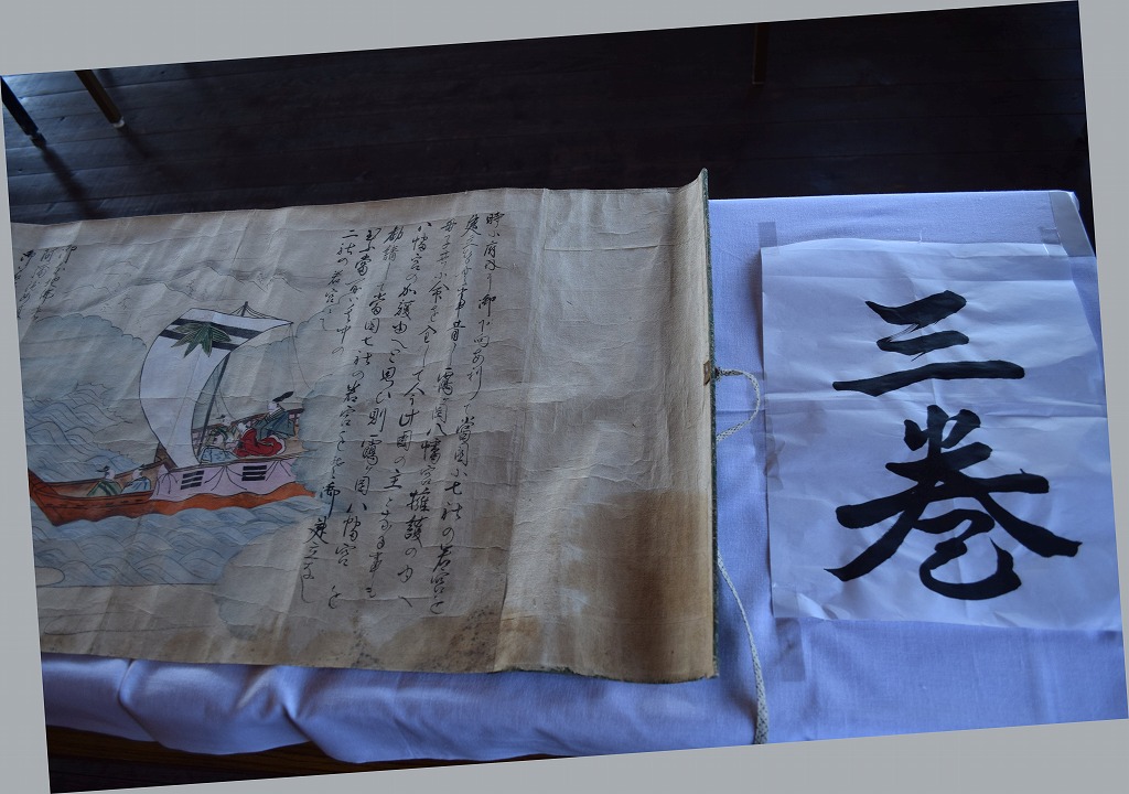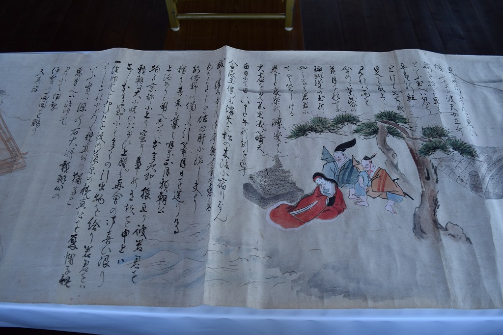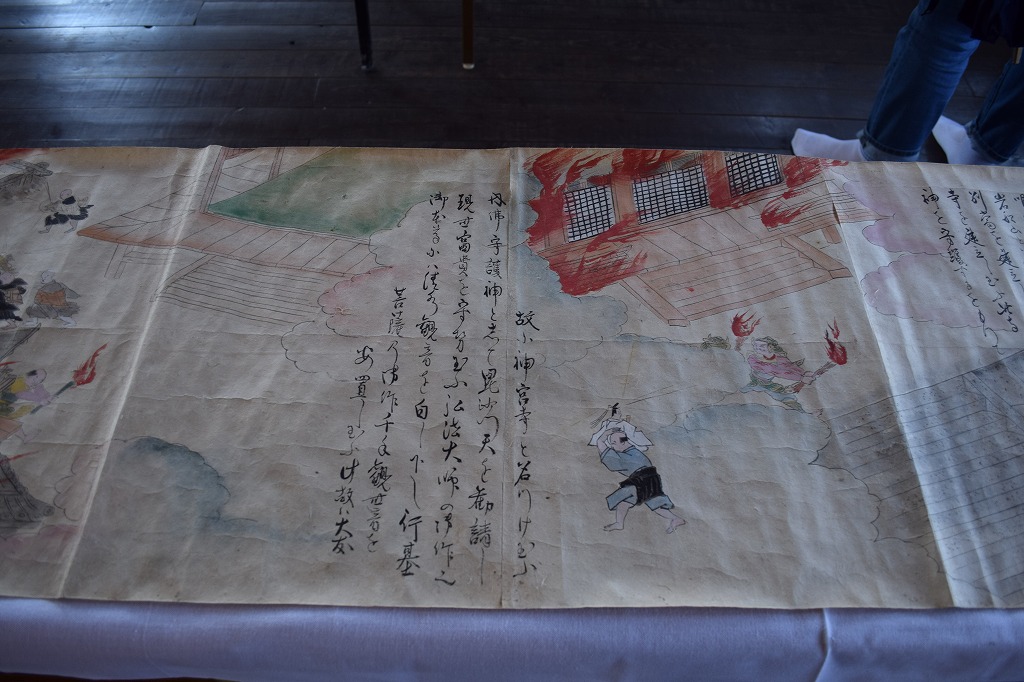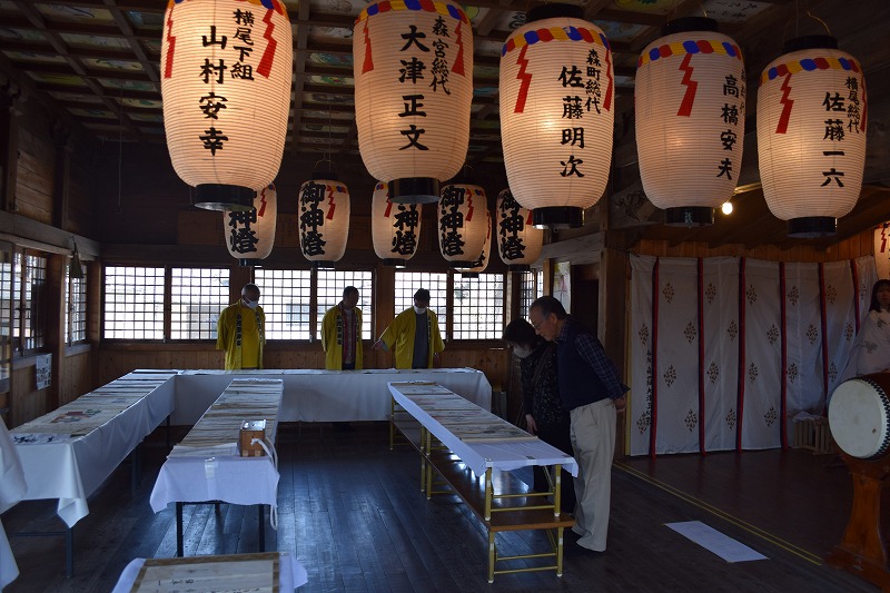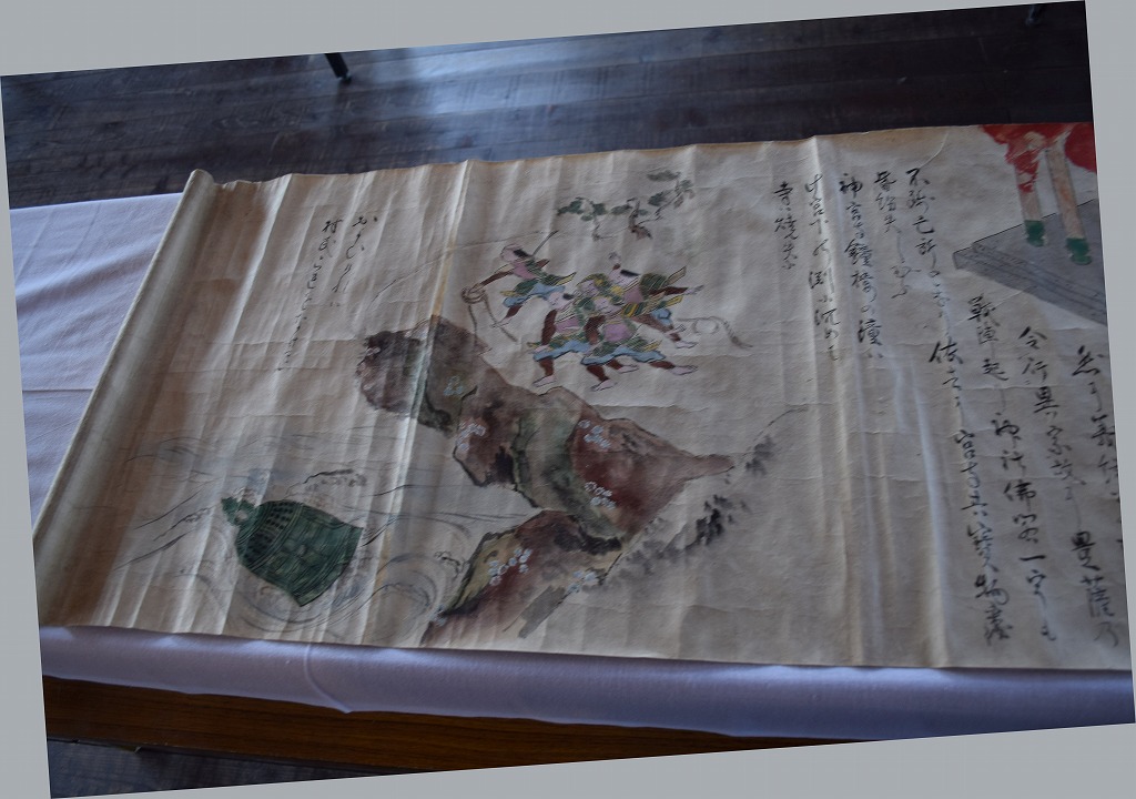 神社では宮総代の方が受付をされており、神社の拝殿には絵巻物がテーブルに展示されていました。受付の方に写真撮影の確認を取るとOKということで急いで絵巻物の写真を撮らせていただきました。慌てて撮ったためうまく撮れておらず後で後悔しています。