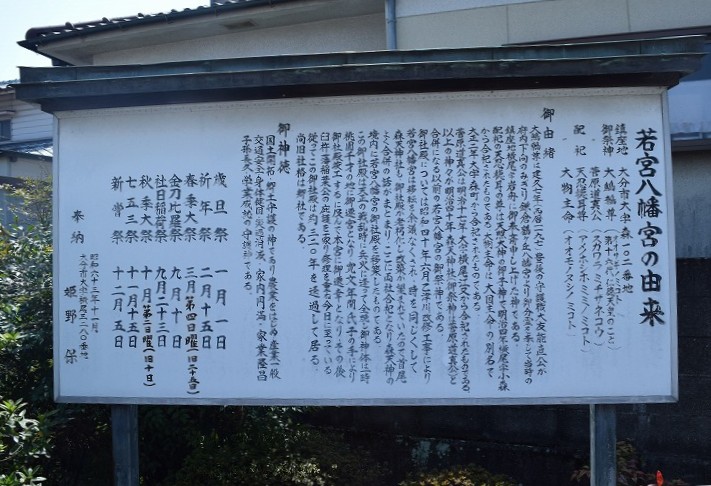 当社八幡宮は相模の国(神奈川県)の鎌倉鶴岡八幡宮の御分霊を祀ったものと言われ、建久年間(1190年~1198年)に国主の大友能直によって創建され、初めは大分市大字横尾字岩船にあって岩船八幡宮として鎮座していました。しかし昭和40年に乙津川改修工事により移転を余儀なくされ、森天神(現在の地にあった)も老朽化により八幡宮との合併の話がまとまり森天神の境内(現在の地)に若宮八幡宮の御社殿を移築しました。 森天神社は、天文11年(1542)6月創建されました。天正14年(1586)大友、島津の戦乱(豊薩戦争)の兵火で焼失(高田の神社、お寺の大半も焼失しています)、その後村民によって寛永5年(1628)再興された社でした。
