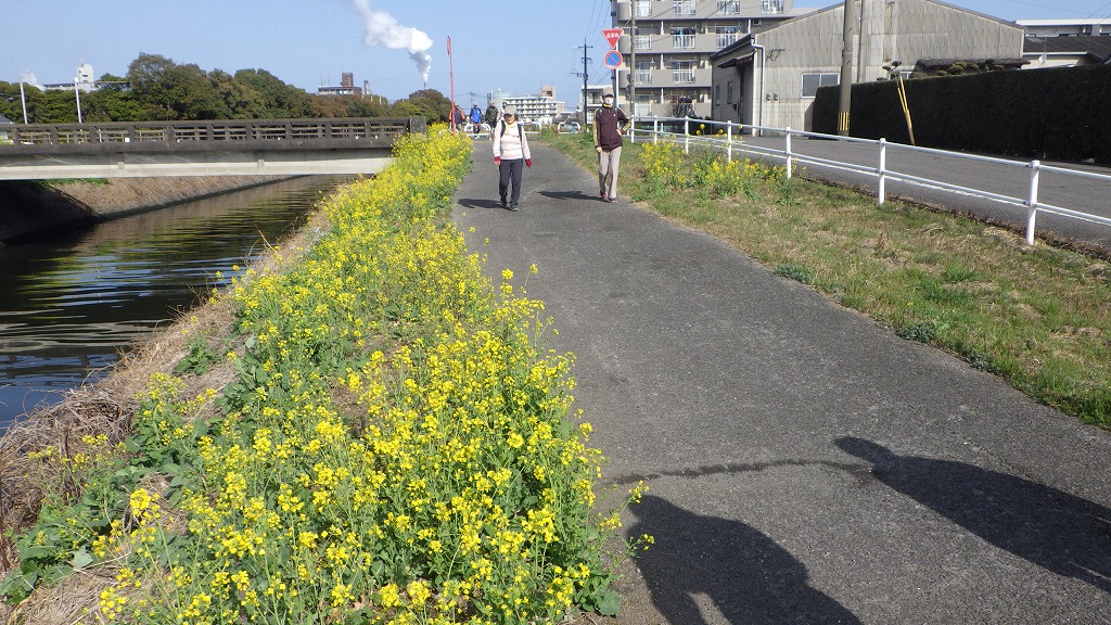 松原緑地を出た後、乙津川沿いを歩いていきます。菜の花が咲き、土筆も芽を出しもう春です。