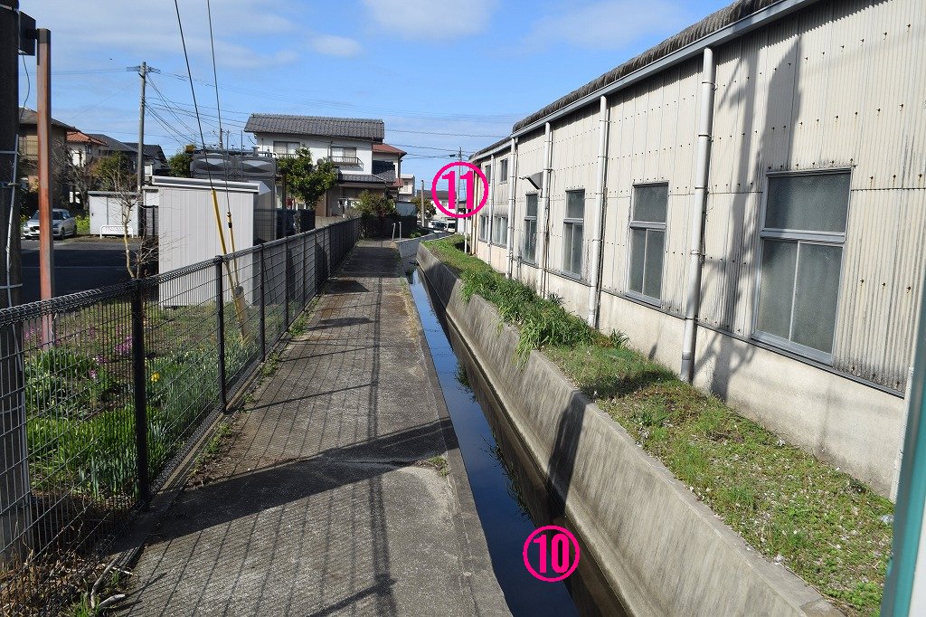 ⑤~⑫まで昭和井路は猪野から横尾方面の道路に平行にあります。⑩~⑪の横は明治小学校あたりです。ただ、建物の間を縫うように走っているためわかりにくい所があります。昭和井路全般に言えることですが、水田のための用水路でありながら周りには家や建物ばかりで水田をあまり見ません。中心部を過ぎればまた増えるのでしょう。