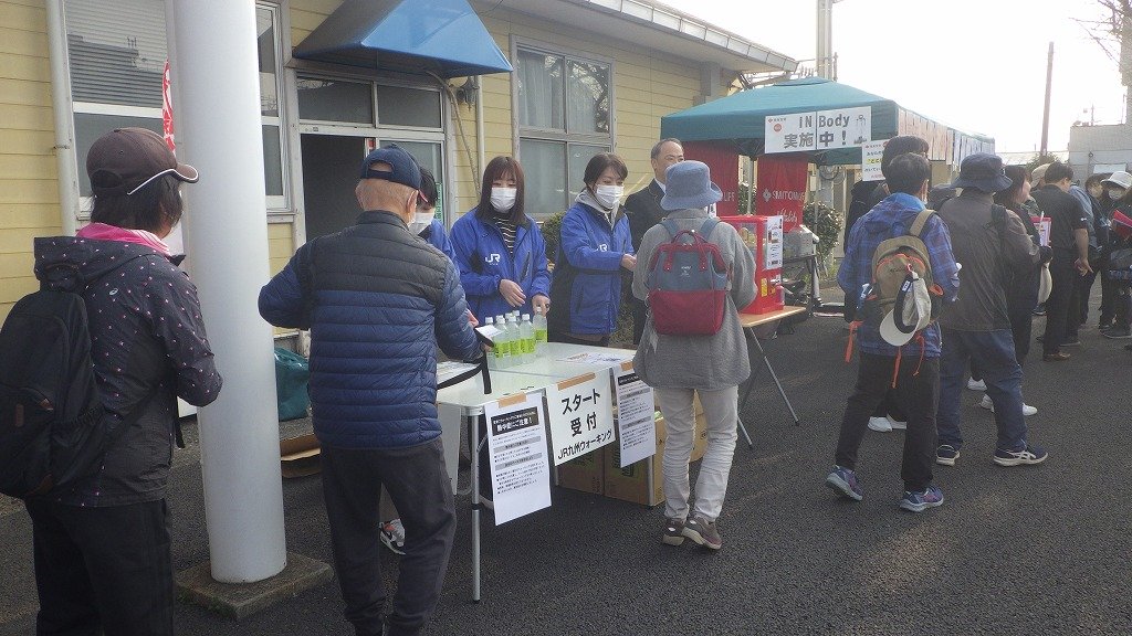 鶴崎駅前で受付開始を待っています。8時30分受付開始です。受付は11時までいつでも良いのですが、受付先着順で何名かには粗品があるそうです。今日の距離は5km、3時までに戻ればよいのでみんな健康チェックをしてもらったりして余裕をもってスタートです。(私が歩き終わって戻ってもまだこれからスタートの人も多くいました。)