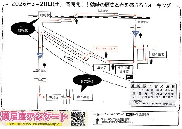 JRウォークはこれまでの大分県ウォーキング協会のウォークとは違い、予約の必要もなく、参加費無料で受付時間(今日の場合は8時30分~11時)の間に、自由に鶴崎駅前の受付で受付をして、そのまま歩き始めます。あとはもらった地図と途中に出ている案内標識、ポイントに立っているガイドの支持に従って歩きます。また、JR九州ウォークはコース上のチェックポイントやゴール地点では地元の人たちが特産品の販売ふるまい(今回は倉光のお酒)、記念品の配布(倉光の酒粕)が行われ、それが楽しみの一つです。