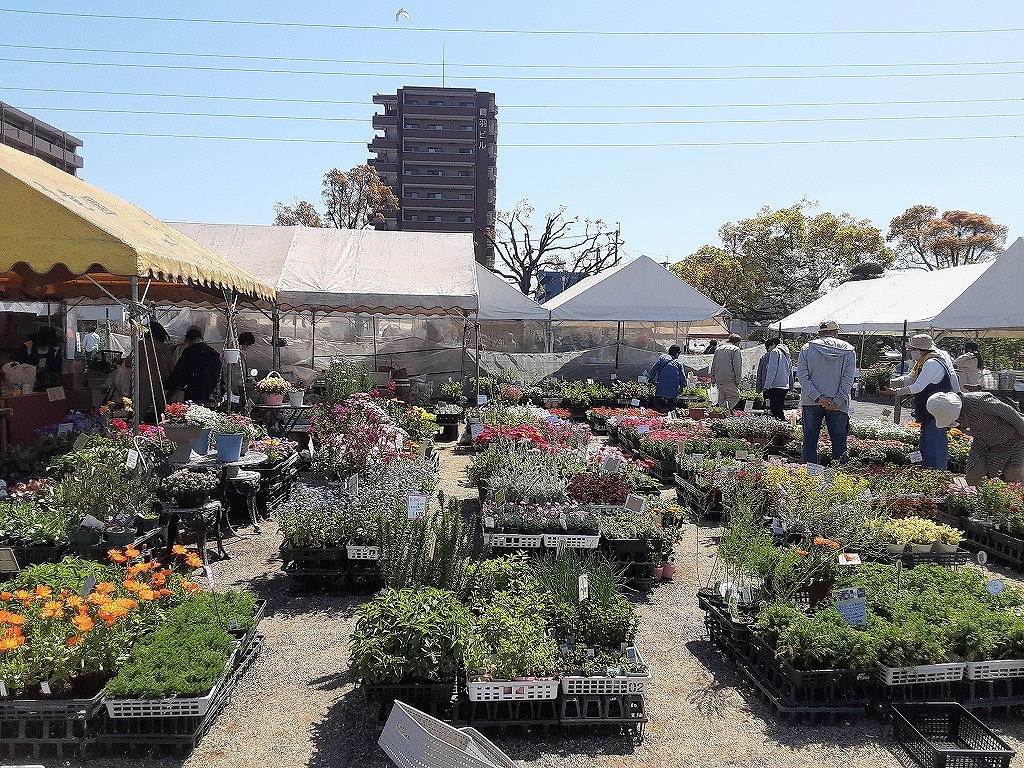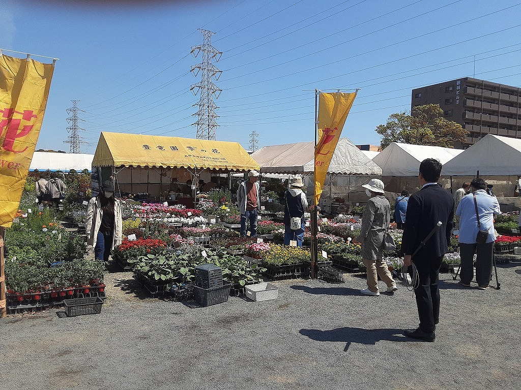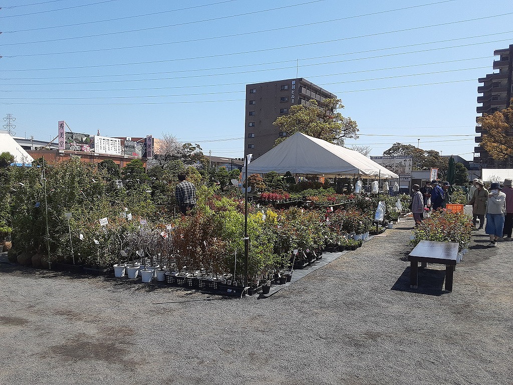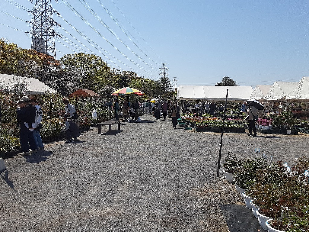 4月8日(水)午前中、平和市民公園の桜を見に行きました。先週末から満開になり今が見ごろです。平和市民公園の多目的広場では「第34回みどりのふれあいいち」が開催されていました。昨日の4月7日からGWあけの5月6日まで開催されます。花や野菜の苗、庭木の販売がされており、盆栽や、数社による庭の展示もされていました。中央の広場では飲食コーナーがあり、 焼きそばなどが販売されていました。