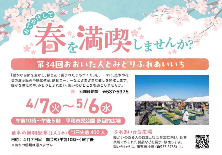 4月8日(水)午前中、平和市民公園の桜を見に行きました。先週末から満開になり今が見ごろです。平和市民公園の多目的広場では「第34回みどりのふれあいいち」が開催されていました。昨日の4月7日からGWあけの5月6日まで開催されます。花や野菜の苗、庭木の販売がされており、盆栽や、数社による庭の展示もされていました。中央の広場では飲食コーナーがあり、 焼きそばなどが販売されていました。